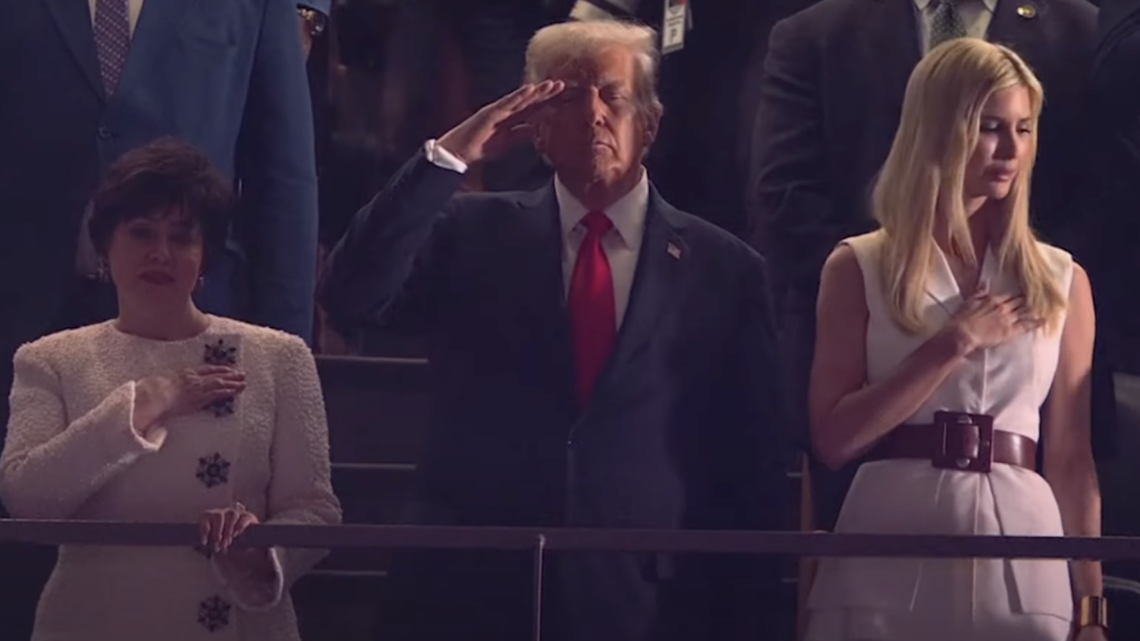 Trump’s son, Eric, and his wife, Lara, were also seen standing next to Benson during the national anthem. To the right of Trump was Ivanka Trump and her son, Theodore.