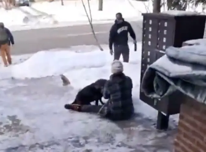 In the midst of chaos, she asks someone to retrieve a leash from the vehicle so she can keep hold of their dog — a small, heartbreaking reminder that life keeps moving even when it shouldn’t.